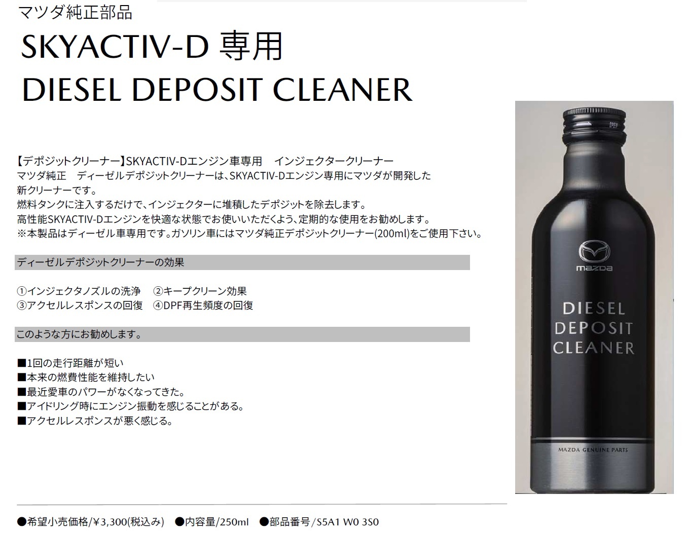 マツダはクリーンディーゼル SKYACTIVE-D のメンテナンス用クリーナーを新商品として発売してます。